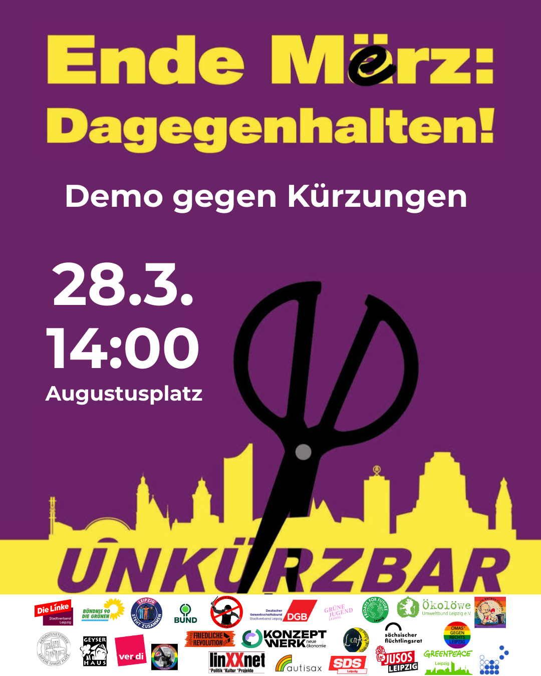 Wir rufen gemeinsam mit einem breiten Bündnis auf: Lasst uns laut werden, für eine soziale, klimagerechte und solidarische Zukunft. Kommt am 28. März 2026 um 14 Uhr in Leipzig mit auf die Straße, bringt eure Initiativen, Ideen und Mitstreiter*innen mit. Leipzig steht für Solidarität statt Spaltung, für Mut statt Angst, für Zukunft statt Kürzung. Lasst uns zeigen, dass wir viele sind und dass wir nicht still bleiben, wenn die soziale und ökologische Gerechtigkeit auf dem Spiel steht.