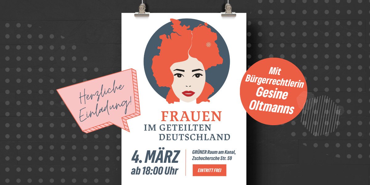 Zum Internationalen Frauentag rücken Claudia und ihr Team Frauen in den Fokus, die im geteilten Deutschland für Freiheit, Selbstbestimmung und politische Teilhabe gekämpft haben. Ab dem 4. März könnt ihr euch im GRÜNEN Raum am Kanal die Ausstellung „Frauen im geteilten Deutschland“ der Bundesstiftung Aufarbeitung ansehen. Zum Eröffnungsabend spricht die Bürgerrechtlerin Gesine Oltmanns von der Stiftung Friedliche Revolution über Frauenbilder, Lebensrealitäten und den Einsatz für Demokratie in der DDR. Geschichte verstehen, heißt Zukunft gestalten – kommt vorbei, seht Euch die Ausstellung an und diskutiert mit!Besuchen könnt Ihr Ausstellung von 4. bis 31. März auch täglich während der Bürozeiten: Mo-Mi/Fr 9-15 Uhr, Do 9-17 Uhr
