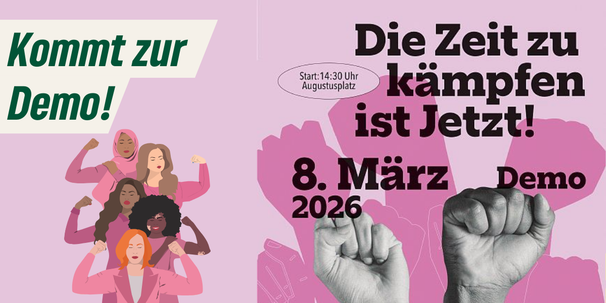 Am 8. März gehen wir gemeinsam mit dem Bündnis Leipzig nimmt Platz und unserer AG Geschlechterpolitik auf die Straße, für Gleichberechtigung, Selbstbestimmung und Solidarität. Der 8. März, der Internationaler Frauentag, ist ein wichtiger Tag, um feministische Kämpfe sichtbar zu machen und unsere Forderungen laut zu vertreten. Kommt zahlreich zur Demo, zeigt Flagge und bringt gerne Freund*innen mit! Gemeinsam sind wir lauter und stärker!