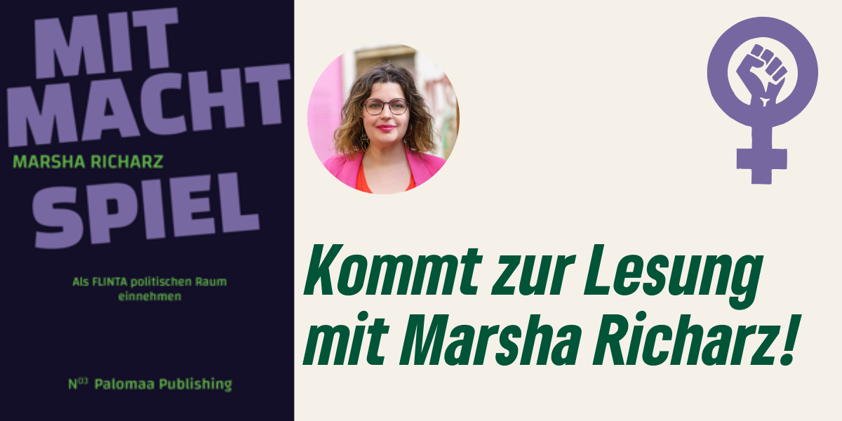 Marsha liest aus ihrem neuen Buch „MIT MACHT SPIEL – Als FLINTA politischen Raum einnehmen“. Im Anschluss an die Lesung laden wir zu einer Diskussionsrunde mit Stadträtinnen und kommunalen Mandatsträgerinnen ein. Gemeinsam sprechen wir über politisches Engagement, Hürden im Alltag, Strategien des Dranbleibens und darüber, wie feministische Politik auf kommunaler Ebene konkret gelebt wird.